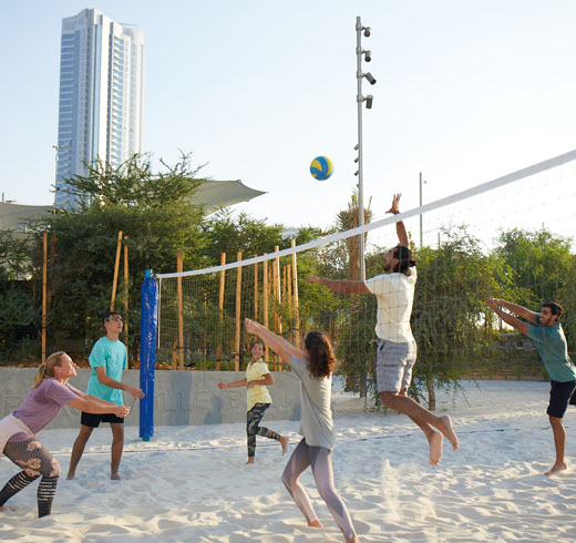 استمتع بدفء الرمال الذهبية بينما تلعب مباراة كرة الطائرة مع أصدقائك في الملعب الموجود في حديقة الفي.