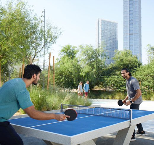 اختبر مهاراتك في رياضة التنس على إحدى طاولات التنس الثلاثة الموجودة دائماً في الحديقة.