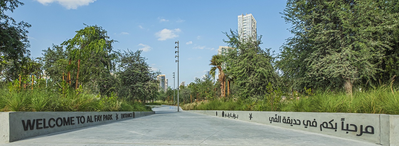 تُعتبر حديقة الفي الأولى من نوعها في الإمارة من ناحية تصميمها المميز بالنباتات والأعشاب والشجيرات المحلية. فقد استعان المصممون بالمناظر الطبيعية والزراعة لتطوير إمكانات الموقع من خلال خلق مناخ خاص يقلل من ضوضاء حركة المرور ودرجة الحرارة ويخلق بيئة شبيهة بالغابات. بحيث يؤدي الممر المنحدر، المتفرع من الطريق الرئيسي، إلى نزول النسيم الجنوبي الأكثر برودة إلى المنتزه، بينما تقلل الأعشاب والشجيرات من تسرّب الرمال وحركتها.