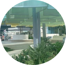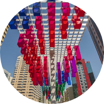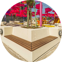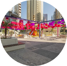 The revitalised urban spaces feature uniquely stylish canopies that are designed to improve the Universal Thermal Comfort Index (UTCI) from May to October, by maximising shade from the morning and afternoon sun, as well as misting systems, ‘green walls’, lightweight concrete pavement slabs and native plants and trees, all of which help cool the area. The canopies also roll up at night to allow cooling of the area in the evenings.